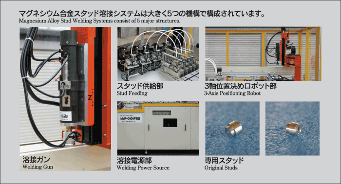 OUTLINE MAGNESIUM ALLOY STUD WELDING SYSTEMS are outstanding technologies invented by our holding company, the ASIA GIKEN Co., Ltd.They received subsidy by Fukuoka Prefecture as one of the most promissing companies,and developed the technologies through a cooperation with Kyushu Institute of Technology and Mechanical Electronics Research Center of Fukuoka. The achievements and the originality were reported at the Welding Society in 2003 and received a high valuation. |
