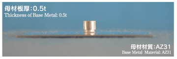 溶接原理 抵抗溶接とアーク溶接の利点を取り入れた方式で、酸化スピー ドが速く、融点の低いマグネシウム合金同士を溶接するた めに、独自の機構と回路を開発。超瞬間溶接(1/10,000秒台) を行うため、0.5t厚以上のマクネシウム合金板に対して、そ の体裁面に溶接痕を殆ど出さずに専用ボス等を正確に且つ、 スピーディに立てる事ができる。 PRINCIPLE OF WELDING We developed the original structures and circuits by taking the advantage of resistance welding and arc welding. The systems allow welding between magnesium alloy materials which are characterized by the fast oxidizing speed and the low melting point. The super instantaneous welding(1/10,000 second)fasten studs on 0.5t and thicker of magnesium base metal precisely and speedy with very little distortion, discoloration or burning. |
