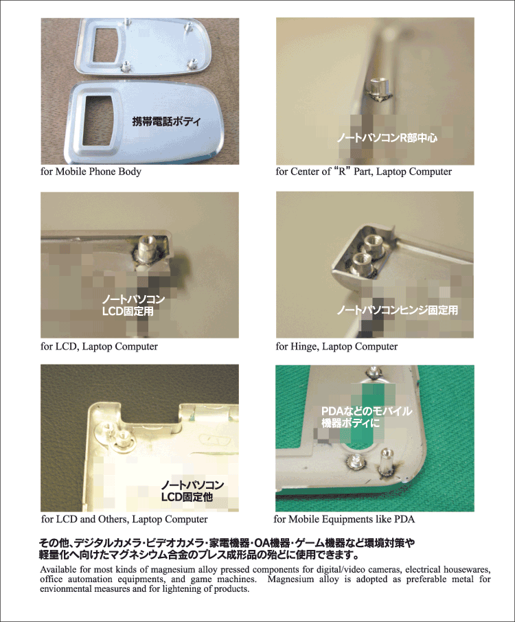 世界で初めての量産納入実績があります。 We proudly announce that we are THE FIRST COMPANY IN THE WORLD that had achieved the mass-production in the field of stud weldjng on magnesium al1oy pressed components for laptop computers. |